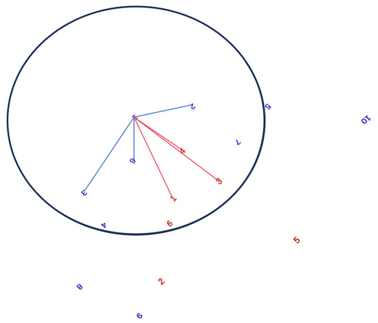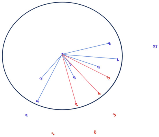 In addition, combat ability of the i-th opponent at time t, defined below. In swarm confrontation, UGVs have a very high hit rate against opponents within range. Therefore, in the calculation of the target’s , the teammates within range are labeled as key support objects, and those larger than range and smaller than range as ordinary support objects. The number of key support objects of this opponent is denoted as , and the life value of the j-th key support object as . The number of ordinary support objects of this opponent is denoted as , and the life value of the j-th ordinary support object as . The individual is considered the most important factor and is assigned a coefficient of 3. Teammates within a range of , are assigned a coefficient of 2. Teammates located at a distance between and are assigned a coefficient of 1. The life value of the target opponent at time t is . can be expressed as: