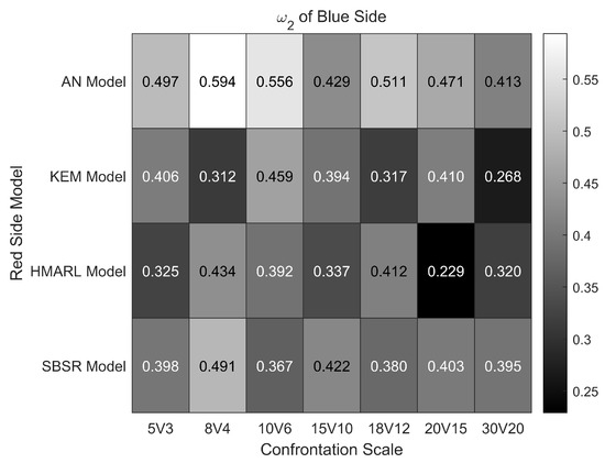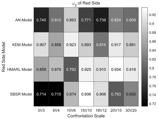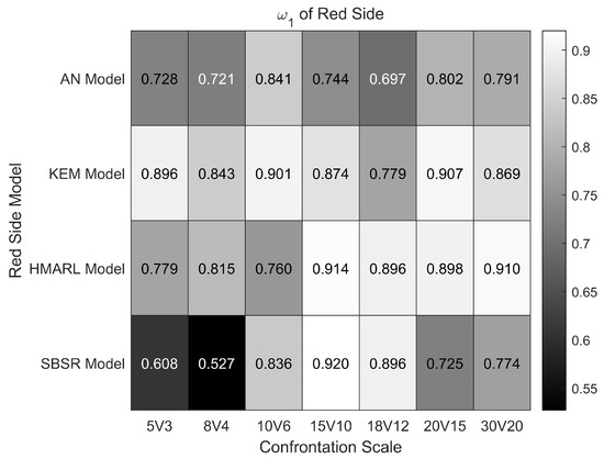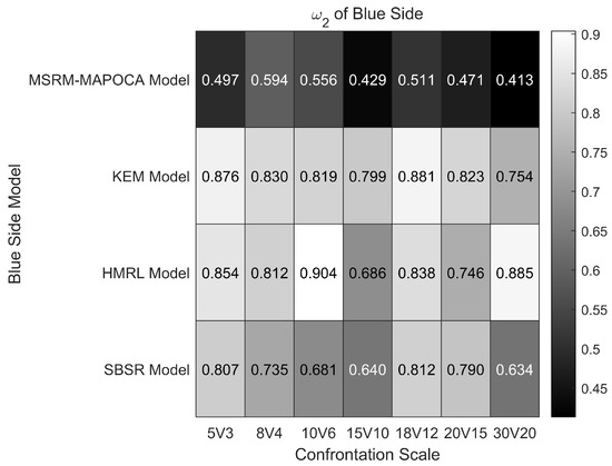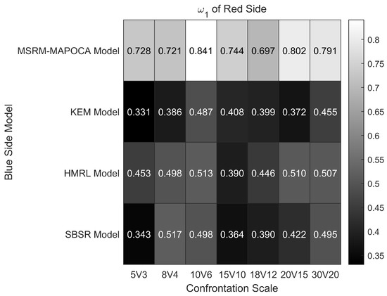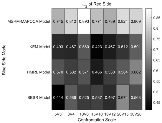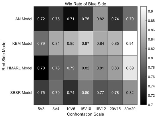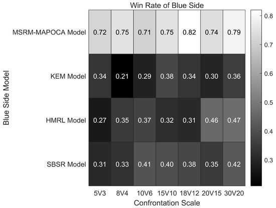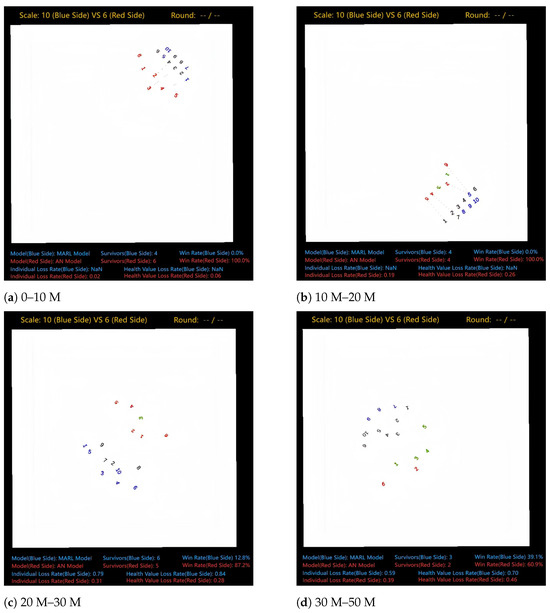 The MSRM-MAPOCA model’s utilization of macro-state-learned strategies plays a critical role in reducing the individual loss rate (). Test results indicate that while the life value loss rates () are comparable between the MSRM-MAPOCA and AN models, the MSRM-MAPOCA model consistently achieves a significantly lower . Furthermore, the extent to which the MSRM-MAPOCA model surpasses the opponent in absolute numbers (rather than as a ratio) strongly correlates with a lower final across varying confrontation scales. Moreover, the MSRM-MAPOCA model demonstrates the ability to effectively extend its advantage, rarely allowing the opponent to overturn the balance of power.