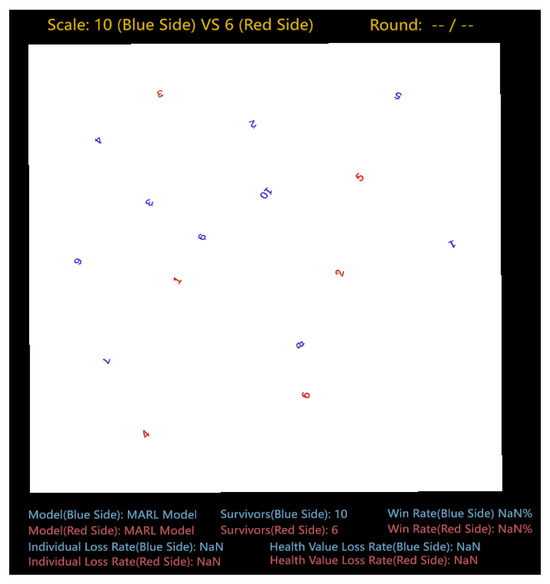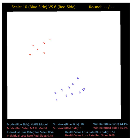 the algorithm efficiency is mainly manifested by two indicators, namely average individual loss rate in winning rounds, denoted as , and average life value loss rate in winning rounds, denoted as . For the blue side, K represents the total number of individuals in the swarm confrontation, H represents the sum of the maximum life values of all blue individuals, and E represents the total number of winning rounds. The number of individuals lost in the i-th winning round () is denoted as , and the sum of life values lost by blue individuals in that round is denoted as . Average individual loss rate and average life value loss rate can be shown in Equations (4) and (5):