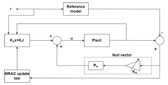 and is an arbitrary null control vector. The first part of the control law u given by (8) is contained in the range space , and the second part is contained in the orthogonally complement nullspace . Pre-multiplying (8) by and observing that and recovers the algebraic form (5) of the VCD (4) regardless of the choice of y. Therefore, y forms a degree of freedom in designing the GDI-based MRC system, and it will be used later in this paper to improve transient response of the MRAC system. The control law u given by (8) can be written as