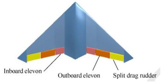 Figure 3 depicts an illustration of a flying wing aircraft. It features two sets of elevons and split drag rudders. The inboard elevons are mostly used to regulate pitch, and positive deflection is considered as symmetric downward deflection. The outboard elevons are employed to control the roll of the vehicle through differential deflection. Yaw control is handled by split drag rudders.
