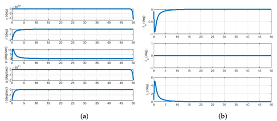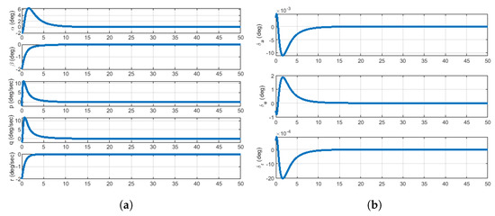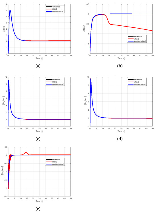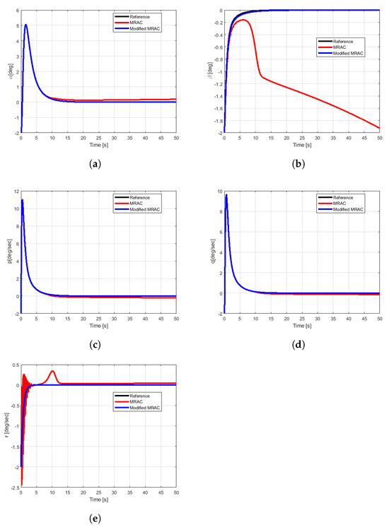 Figure 6, Figure 7, Figure 8, Figure 9 and Figure 10 were created with learning rates of , , and . By examining Figure 6, it is obvious that the modified MRAC method achieves precise tracking of the reference model and produces smooth trajectories. As illustrated in Figure 6b, MRAC is unable to achieve acceptable tracking performance for the sideslip angle due to a minor drift in the corresponding adaptive parameter. Additionally, as a result of the learning rate, Figure 6e demonstrates oscillatory behavior. The suggested scheme overcomes these disadvantages by incorporating Equation (47) into the control law of the classic MRAC in order to address the tracking error problem. Furthermore, the projection matrix used in Equation (48) permits the null control vector to act on the null space of control coefficients, thereby suppressing the oscillations.