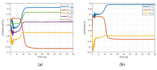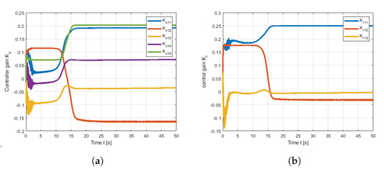 MRAC adaptive parameters. (a) Feedback gain. (b) Feedforward gain.