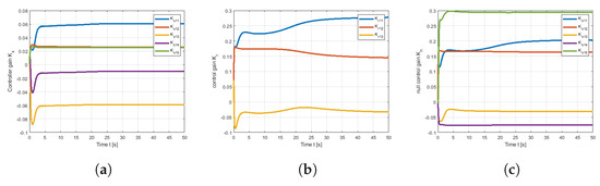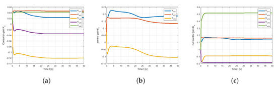 Modified MRAC adaptive parameters. (a) Feedback gain. (b) Feedforward gain. (c) Null gain.