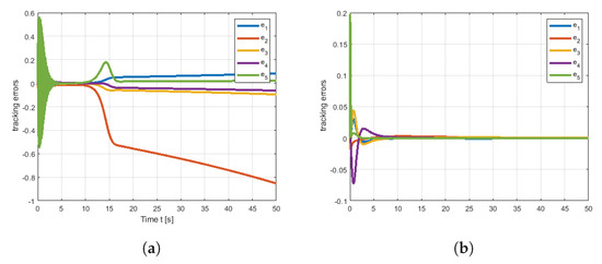 Error dynamics for MRAC and modified MRAC. (a) MRAC tracking errors. (b) Modified MRAC tracking errors vs. time.