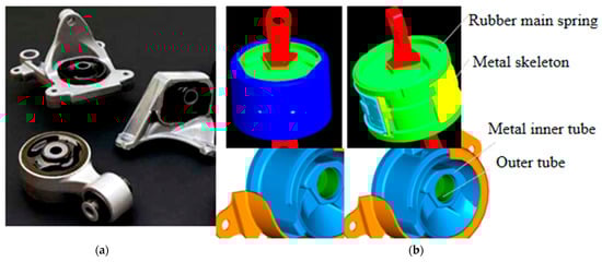 Lu established the lumped parameter model of the hydraulic bushing by comparing the working principle of the hydraulic suspension and the hydraulic bushing. Based on this model, the transfer function of excitation and response was deduced, and the variation rule of suspension dynamic characteristics was revealed. Sauer adds a pressure-reducing valve to the conventional single inertial-channel hydraulic bushing to protect the bushing and adjacent structures from high-pressure spikes. An experimental model was established based on the structure to verify the performance of the improved structure. Literature [5,6,7,8] designed a controllable bushing model with one long pipe, one short pipe, and several current-limiting elements. The lumped parameter model with different design characteristics is established, and the required dynamic characteristics are obtained by changing the parameters, which reduces the modeling and testing process in the design process. Feng replaced the fluid in the hydraulic bushing with magnetorheological fluid and established the constitutive model and mathematical model of magnetorheological fluid [9]. Using a mathematical model to obtain parameters, the control performance of magnetorheological fluid is verified by simulation, and the prediction of mechanical properties is provided. Chen [10] used the lumped parameter model to calculate the dynamic stiffness curve of the mounting bushing and optimized the mounting dynamic stiffness model. Graeve [11,12,13,14,15] designed a hydraulic bushing with a vacuum compensation chamber. In order to simulate the performance of the part, the diameter and volume flexibility were calculated by the finite element method. By adjusting the ratio of channel length to diameter, the life of structural parts is increased by 50%. Negrete [16] adopted the fluid–structure coupling analysis method, applied the theoretical knowledge of fluid mechanics to the finite element analysis method, and accurately obtained the dynamic characteristics of the hydraulic bushing. The peak frequency of damping Angle obtained by simulation analysis is close to the experimental result. Lu used Abaqus software (6.12 version) to perform the static analysis of the rubber main spring to ensure that the design size met the requirements of the three-dimensional static stiffness. The sealing performance of the hydraulic bushing is improved by installing an O-ring in the groove outside the inertial channel [17].