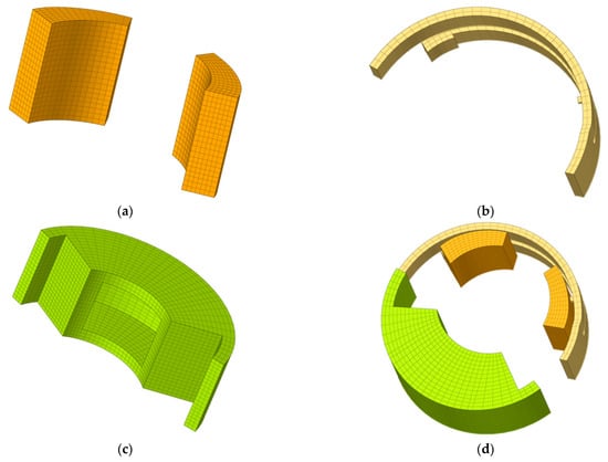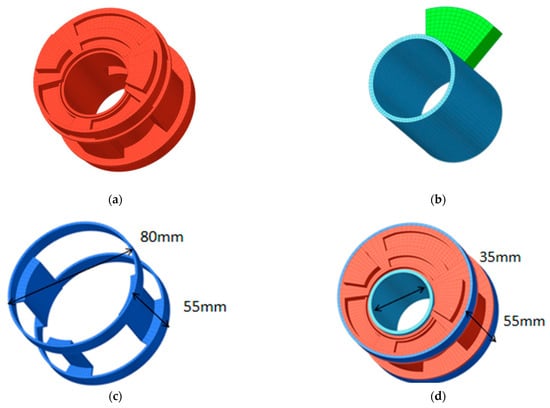 Finite element model of solid part of hydraulic bushing. (a) Rubber main spring mesh; (b) inner tube and limit block mesh; (c) metal skeleton mesh; (d) complete model mesh.