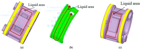 In the three-dimensional model of hydraulic components, there are generally only solid parts, and the model of liquid parts needs to be established by software. The liquid in the hydraulic bushing exists in the upper and lower liquid chambers and the inertial channel body, as shown in Figure 3. When the liquid mesh model is established, the three parts are separated, and the liquid mesh is established in HyperMesh software (11.0 version) (Figure 3a–c). The red color in the model indicates the area where the liquid flows.