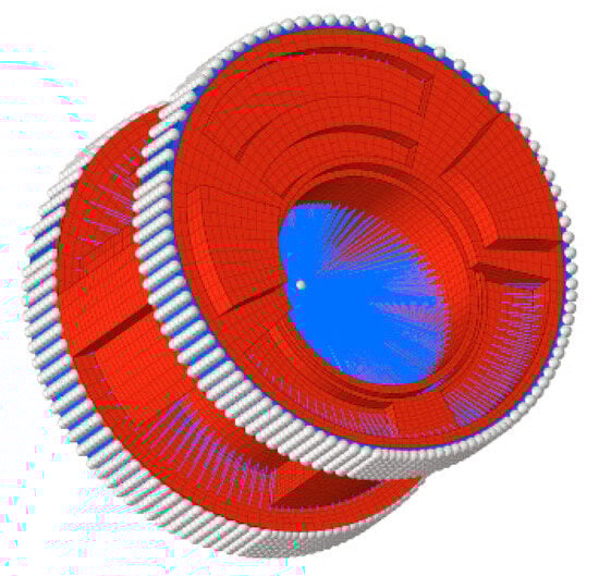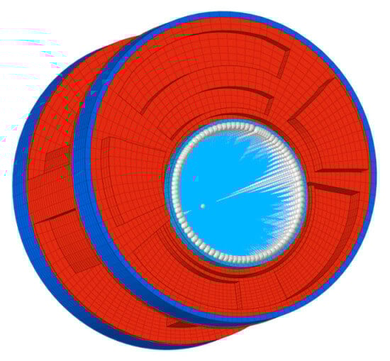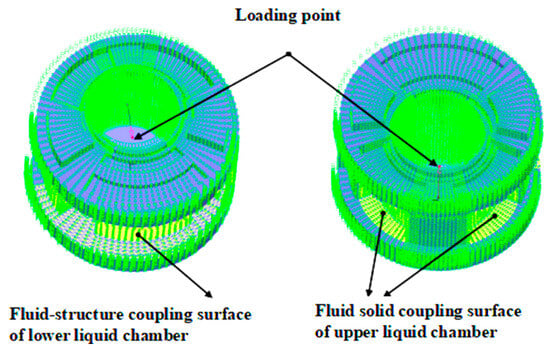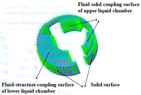 For the hydraulic bushing, the area where the solid and liquid interact is the contact surface between the upper and lower liquid chambers and the rubber master spring. These contact surfaces are set as fluid–structure coupling surfaces. In order to shorten the simulation analysis time and improve the simulation efficiency, the type and size of solid surface mesh and liquid surface mesh on the fluid–structure coupling surface are set the same. The finite element model of the solid part of the hydraulic bushing can be obtained in the ADINA-Structure module, as shown in Figure 8.