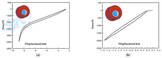 The vertical and longitudinal static characteristics of the hydraulic bushings were tested with a loading speed of 0.2 mm/s and three cycles. Load loading speed Reference rubber bushing enterprise internal standards and references [17,18,19,20]. The loading range of the vertical static characteristic test is −5000 N~0 N, and the value of the test result is −2200 N~−1800 N. The loading range of the longitudinal static characteristic test is −2000 N~0 N, and the value of the test result is −1200 N~−800 N. The static characteristic test results are shown in Figure 11.