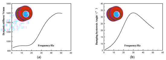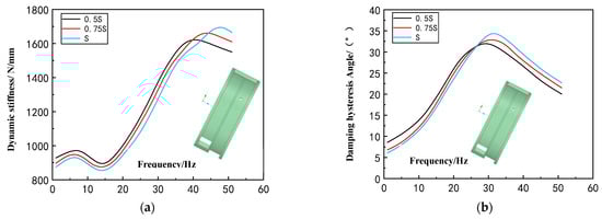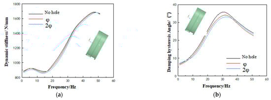 The simulation and analysis of the hydraulic bushing feed behavior of the inertia channel with no aperture and 2φ aperture are presented in Figure 24. From the contrast curve of dynamic stiffness, it can be seen that the change in aperture has little influence on the dynamic stiffness of the hydraulic bushing. It can be seen from the contrast curve of damping hysteresis Angle that when the frequency is less than 38 Hz, the damping hysteresis Angle decreases with the increase in the aperture.