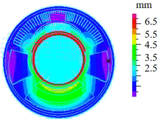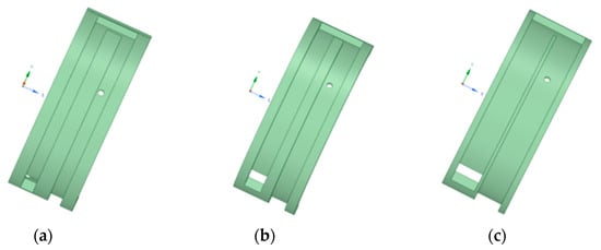 The improvement of the vibration isolation performance of the hydraulic bushing mainly comes from the damping generated by the liquid. Since the rectangular slot of the inertial channel is close to the edge, the cross-sectional area of the inertial channel is reduced to 0.75 times and 0.5 times the initial. The initial cross-sectional area is denoted as S (53 mm2), and the other two cross-sectional areas are denoted as 0.75 S and 0.5 S, respectively. Three-dimensional modeling software was used to modify the original inertial channel body, and the modified three-dimensional model was shown in Figure 21.