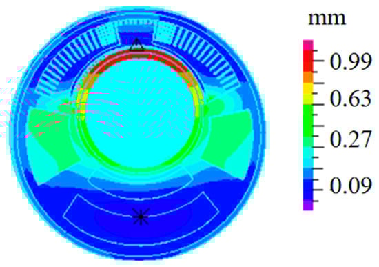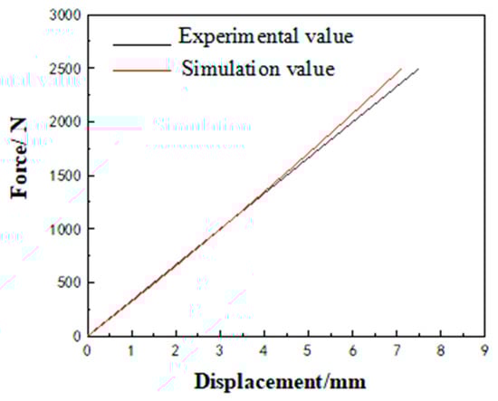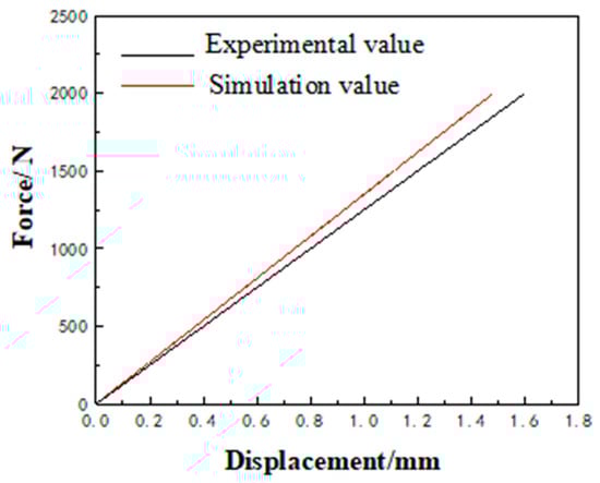 The vertical and longitudinal static characteristics of the hydraulic bushing were simulated, respectively. During the vertical static stiffness simulation, the maximum loading force is 2500 N. The incremental force is 100 N/s, and the loading time is 25 s. The comparison curve between the cloud image of the simulation results and the test value is shown in Figure 13 and Figure 14. The reliability of the model is higher than that of the simulation and test results. The longitudinal static stiffness simulation was carried out. The maximum loading force was 2000 N, the incremental force was 100 N/s, and the loading time was 20 s. The comparison curve between the cloud image of the simulation results and the test value was shown in Figure 15 and Figure 16. It can be seen from the two groups of comparison curves that the trend of the simulation curve is consistent with the test value, and the error is small. Simulation models can be used for performance prediction.
