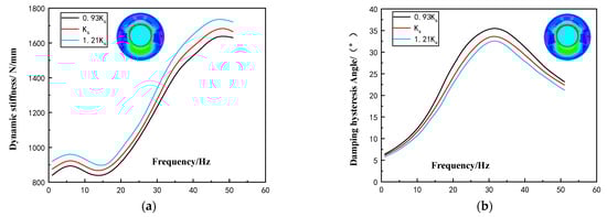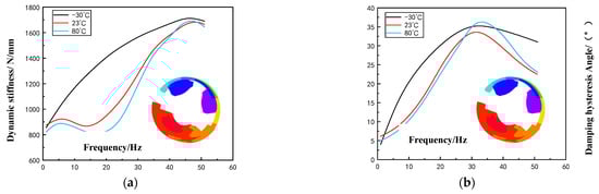 Three constitutive models of different temperatures and liquid viscosities were applied to the finite element model of the hydraulic bushing, and dynamic characteristic simulation analysis with an excitation amplitude of 0.3 mm was carried out to obtain dynamic characteristic curves at different temperatures, as shown in Figure 17. The three temperatures, respectively, simulate the rubber bushing at low temperature, normal temperature, and ultra-high temperature. The temperature was selected with reference to internal industry standards [14,15,16,17,18,19].