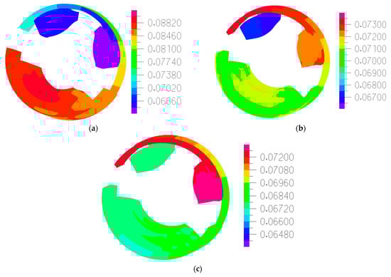 Cloud picture of liquid pressure at different temperatures at 51 Hz frequency and 1.1 s time (unit: MPa). (a) Cloud image of liquid pressure at −30 °C; (b) Cloud image of liquid pressure at 23 °C; (c) cloud image of liquid pressure at 80 °C.