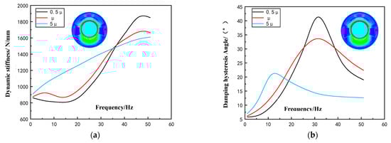 It can be seen from the dynamic stiffness curve that when the frequency is less than 34 Hz, the magnitude of dynamic stiffness increases with the increase in liquid viscosity. When the frequency is greater than 37 Hz, the trend is reversed, and the peak value of dynamic stiffness decreases with the increase in liquid viscosity. It can be seen from the damping hysteresis Angle curve that the viscosity has a great influence on the damping hysteresis Angle. With the increase in viscosity, the peak value of the damping hysteresis Angle curve decreases gradually. The peak frequency of the damping hysteresis Angle curve with a viscosity of the 0.5 µ is basically the same as that of the damping hysteresis Angle curve with a viscosity of the µ.