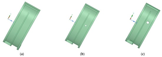 Three-dimensional models of inertial channel bodies with different compensation hole apertures. (a) No hole; (b) φ; (c) 2φ.