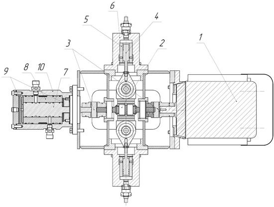 Construction of a low-flow plunger pump: 1—asynchronous electric motor, 2—cam mechanism, 3—shaft coupling, 4—plunger, 5—fluid liner, 6—pump cylinder, 7—valve spool, 8—control valve sleeve, 9—end plates, 10—hydraulic control valve.