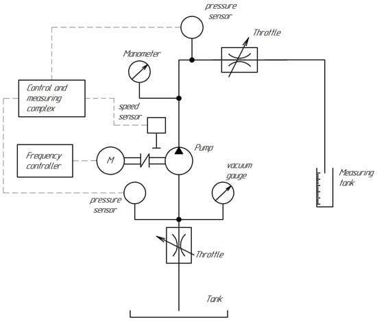 The asynchronous motor of the bench, controlled by a frequency converter, made it possible to adjust the pump shaft speed to change its capacity. The discharge line throttle was designed to simulate the hydraulic resistance of the system. The suction line throttle was designed to simulate the hydraulic resistance of the line. The pressure gauge and vacuum gauge monitored the pressure in the discharge and suction lines, respectively. The pump performance was determined volumetrically by means of a measuring vessel and a stopwatch. The pressure and speed sensors were connected to an E20-10 fast analogue-to-digital converter module, the data from which, in turn, were transmitted to a laptop computer.