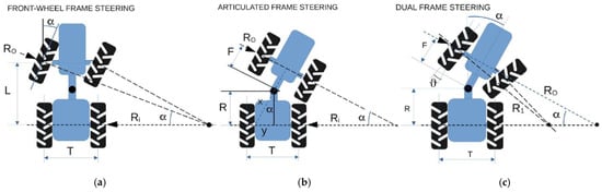 Schematics of front steering (a), articulated steering (b), and dual steering systems (c).