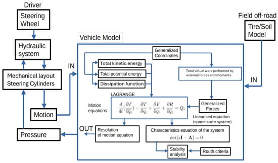 On the introduction of the tractor virtual model in 3D-BG, Xu and others [15] advocate for the incorporation of cylinder speeds as inputs, yet they subsequently employ algorithms based on the principle of minimum resistance within the Lagrangian framework. Figure 2 presents a block diagram representing the Lagrange approach. It is important to note a discrepancy: while the depicted inputs are forces, this contradicts the physical principle that the input variables from the hydraulic actuators, applied to the multibody model, should be velocities rather than forces. Similarly, the inputs from the tire/wheel interaction are forces exerted by the ground, and they impose a certain kinematic constraint dictated by the cylinders. Specifically, the mechanical domain is modeled using a 3D-BG vectorial domain, while the hydraulic domain is represented through a 1D-BG scalar domain. De las Heras and Codina [16] have a proven track record and extensive experience employing this methodology. This article focuses on the structural baseline part, consisting of a finite number of rigid bodies and joints. Several modules of this toolbox have demonstrated successful application in vehicle modeling to predict dynamic behavior, as shown by Filippini [17,18], and have been effectively employed in another project related to vehicle fault diagnosis by Silva L. et al. [19]. The spatial motion of the rigid bodies is determined using the well-established Euler equations. Moreover, it is highly capable of interacting with multiple energy domains, as indicated by Borutzky [20] and Thoma J. [21]. Regarding multibody systems, a variety of bond graph techniques have been introduced: Karnopp and Rosenberg [22] have outlined a strategy for generating bond graphs using Lagrange’s equations, and Bos [23] has presented a modular strategy rooted in Newton–Euler equations. Various experimental and numerical tests have been conducted by the authors to establish a clear path for investigating the optimal approach to achieving controllability in travel and drivability in dual steering mode. The first technical experiment, carried out using a tractor prototype, aimed to transition from an Ackermann steering system to a dual steering system. This was followed by a model of the entire tractor, created using 20SIM v5.1. [24]. This article demonstrated a possible control strategy for a steering system.
