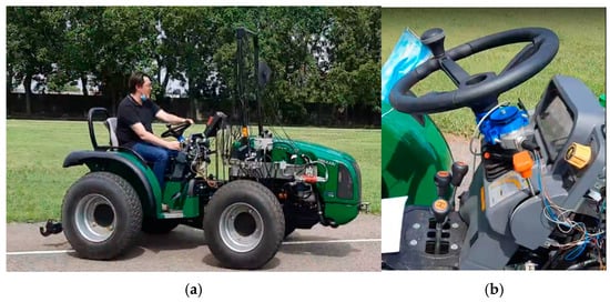 (a) Prototype tractor with a new ECU and new hydraulic system under analysis; (b) roto transducer installed under the steering wheel to log the steering movement in the two working conditions under investigation: traveling in dual steering mode and traveling in Ackermann mode.
