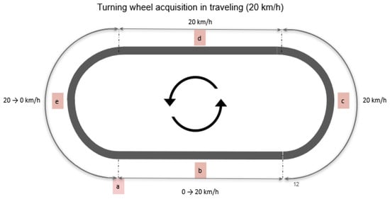 Figure 4 depicts the specific track used for conducting field tests and evaluating both stability and vehicle trajectories. The letters a–e depicts the speed trend. The track was asphalted (not tarmac), dry (on a sunny day at 28 °C), and in a test area closed track in northern Italy. The test track consisted of multiple segments, starting at point “a”, which marks the beginning of the trial. Prior to the start of the experiment, a briefing session was held, involving full steering maneuvers to the left and right. This was carried out to demonstrate the functionality of each sensor and the data-logging equipment. No ground experiment was performed during this period. The main sensors used for the experiment are described in Table 3.
