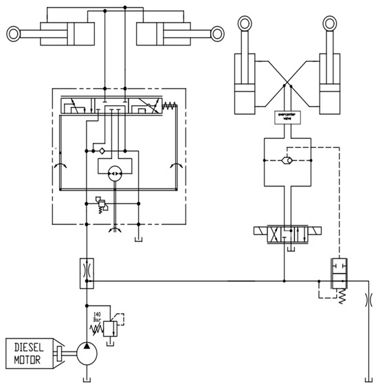 Before analyzing the dynamic model, it is important to provide an overview of the hydraulic circuit used to control the dual steering system in the tractor under analysis. The vehicle under study is a tractor with isodiametric wheels, central articulation, and directional front wheels, as depicted in Figure 5. Additionally, Figure 6 presents a simplified diagram of the hydraulic circuit with a description for each component shown in Table 4. The approach encompasses two primary modules: the hydraulic domain model and the mechanical domain model. Firstly, this study addresses the actuators for the implements, which include both the steering system and its associated hydraulic drive system. These systems are treated as one-dimensional (1D) systems in our modeling approach, utilizing fundamental 1D bond graph elements. Finally, the validity of this approach will be confirmed by comparing its numerical results with a series of experimental data obtained from field tests.