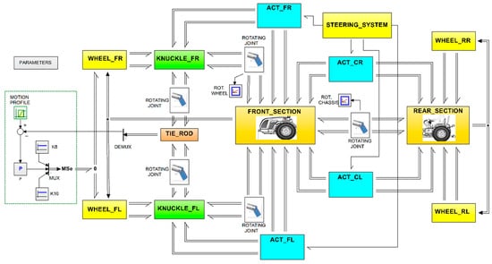 The dual steering tractor model, depicted in Figure 7, was designed to emulate a tractor with its two rigidly joined bodies (rear and front sections), with the pivot point located near the geometric center of the vehicle. Alongside the pivot point system, the vehicle’s two bodies are connected by hydraulic actuators integrated into the central steering system. It is worth noting that this type of vehicle is not equipped with suspensions, and the cantilever engine is mounted in a forward position, affecting the center of gravity (CoG) and the distribution of mass. More than 50% of the tractor’s weight is supported by the front axle, mainly due to the weight of the diesel engine. The vehicle’s sections are modeled as rigid bodies, with a local coordinate system (x, y, z) attached to their center of mass and aligned with their principal axes. Each section has a mass mmm, and moments of inertia JrJ_rJr (roll) about the x-axis, JpJ_pJp (pitch) about the y-axis, and JyJ_yJy (yaw) about the z-axis. To determine the motion of a rigid body in space, a set of relations known as Euler equations is used. Additionally, it is necessary to model the interconnections between rigid bodies (joints) and the actions of the external environment on them. In the model, a joint represents the force relationship between the rigid bodies it connects, depending on their position and relative orientation. In summary, the dual steering tractor is composed of multiple interconnected rigid bodies, including the rear- and front-section bodies (orange box), tie rod (red box), knuckles (green box), and wheels and wheel/tire assemblies (yellow box), as can be seen in the 3D-BG of Figure 7.