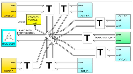Given the hierarchical structure—model, submodels, BG basic elements, and constitutive equations—Figure 7 presents the bond graph submodel schematic implicit in the front-section icon. To establish the connection between the rigid body of the front section and the central rotating joint (white box), a translation is required. Additionally, a series of translations (T elements) are necessary to facilitate the interconnections between this rigid body and its interactions with external environmental forces, linking them to the steering hydraulic actuators (blue box) and the wheels (orange box).