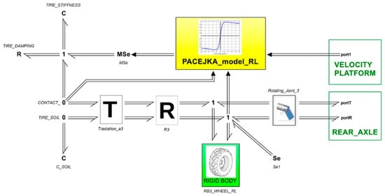 Next, this study will focus specifically on the wheel submodule, which, as shown in Figure 8, incorporates the behavior of the wheel as a rigid solid (green box) and the tire/soil interaction (yellow box).