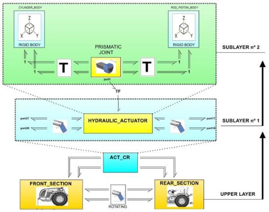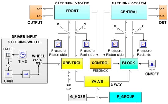 In Figure 9, which shows a part of the scheme from Figure 6 in the bottom left corner, the icons of the hydraulic actuators (blue box) responsible for the kinematics of the operator-imposed steering are visible. These submodels are connected to the hydraulic system submodel (yellow box in Figure 6). Additionally, Figure 9 illustrates the hierarchical structure of the hydraulic cylinder, highlighting the connection between the mechanical domain and the hydraulic domain.