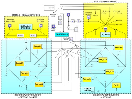 As described in the previous section and outlined in Figure 6, the four hydraulic actuators are responsible for the dual steering system implemented in the tractor. Building on this, using the hydraulic domain as a reference point, Figure 10 presents the scalar bond graph structure developed for the proposed hydraulic circuit to simulate the dual steering system (front and central steering). Additionally, the 3D prismatic joint is connected to a 1D bond graph diagram corresponding to the fluid mechanics domain, incorporating equations of mass conservation (including oil compressibility) and the conservation of momentum.