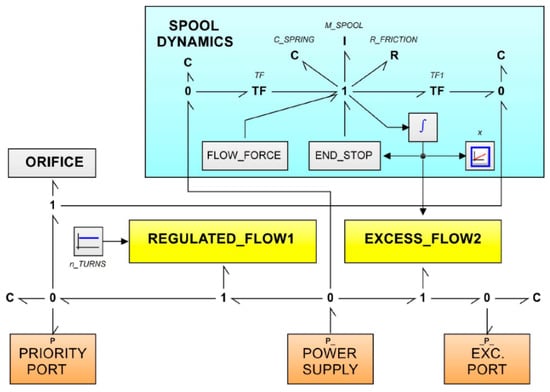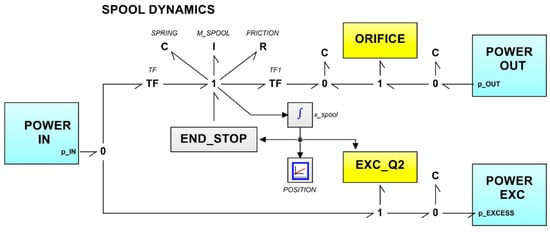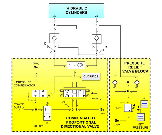 The key submodels in these two bond graph diagrams correspond to the icons labeled “Port_iii”, which physically represent the nine variable orifices of the rotary valve (spool/sleeve assembly) in the case of the orbitrol element, and the corresponding orifices of the directional control valve in the case of the three-way valve. To conclude this section, it is necessary to describe the submodel referred to as the block (green box in Figure 10). In this submodel, it is important to highlight the presence of the proportional valve with pressure compensation, for which the corresponding bond graph diagrams are illustrated in Figure 14 and Figure 15.