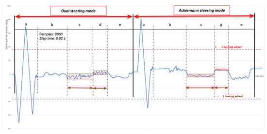 Circuit path for the stability experiment in dual steering and Ackermann mode where a–e are the speed segments of the Figure 4 (time vs. steering grade displacement).