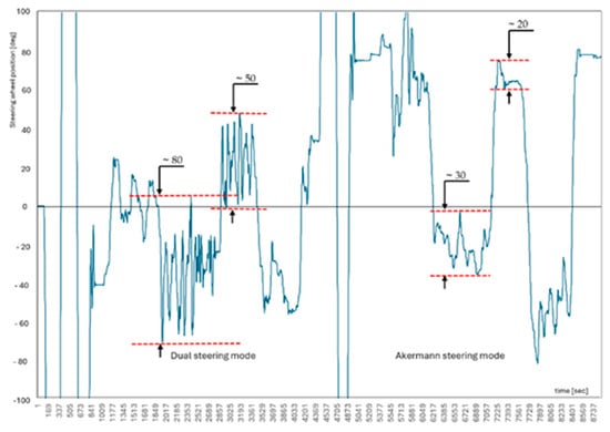 The trends displayed in Figure 16 represent the steering displacement logged by the rotary sensor, as reported in Table 2. Sector “a” corresponds to the warm-up phase, where the tractor is stopped and a full steering displacement is applied. This action is used to identify any issues before the tests. Sectors “c” and “d” highlight a significant shift in the tractor’s behavior. A noticeable trend can be observed at the corners, where the external forces are higher. The tendency is an increase in steering noise, especially in dual steering mode. Finally, sector “e” represents the last corner before the finish line. As shown in Figure 16 (8860 samples every 0.02 s as the logging time), the variability between the maximum and minimum values changes as the system switches from dual steering mode to Ackermann mode.
