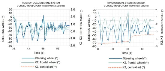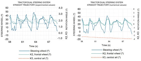 Experimental and numerical results regarding the dual steering systems (involving corrective counter of steering wheel movement in dual-mode steering) during curved and straight trajectory at 20 km/h.