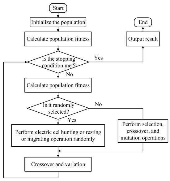 From Equation (51), it is evident that the designed position control contains several control parameters to be optimized. Utilizing the trial-and-error method to determine the parameter values of the controller can be complex and may not fully exploit the potential of the proposed control algorithm. To address this, a novel hybrid intelligent optimization algorithm is adopted in this section for the optimization and tuning of the control parameters of the proposed method. A new population-based global optimization algorithm called Electric Eel Foraging Optimization (EEFO) was introduced in [45]. In solving optimization problems, it uses simulations of the four foraging behaviors of electric eels for exploration and exploitation and designs an energy factor to facilitate the transition from exploration to exploitation. Although the advantage of EEFO lies in the fact that it does not require the setting of fixed parameters, and it excels in exploring the search space by mimicking the natural foraging behaviors of electric eels, it, like other heuristic optimization algorithms, may also fall into local optima. This is particularly evident in optimization problems where the global optimum is very close to local optima, making it difficult for EEFO to further improve the solution and thus failing to identify the true global optimum. Furthermore, when dealing with high-dimensional optimization problems, computational complexity can significantly increase. Searching in high-dimensional spaces typically requires more computational resources and time, which might affect the efficiency and practicality of the algorithm. Therefore, this paper develops a variant of EEFO, named GA–EEFO, by introducing additional effective operators, including selection, crossover, and mutation. GA–EEFO is a hybrid algorithm combining Genetic Algorithm (GA) and Electric Eel Foraging Optimization (EEFO). The hybrid algorithm aims to enhance the efficiency and effectiveness of solving complex optimization problems by integrating the strengths of both optimization algorithms.