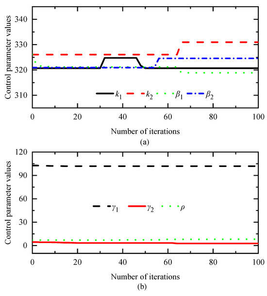 Control parameter variation curve. (a) k1, k2, β1 and β2. (b) γ1, γ2 and θ.