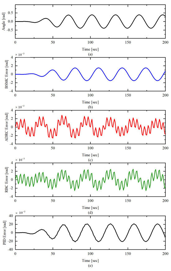 Simulation comparison of the control system. (a) Angle command signal, (b) Error of BSMC controller, (c) Error of ADRC controller, (d) Error of RBC controller, (e) Error of PID controller.
