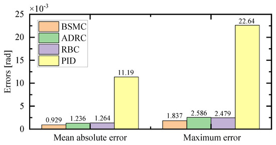 Figure 8 shows a horizontal comparison of the performance of these controllers. The analysis focuses on the average absolute error and the maximum error. The average absolute error is calculated by taking the absolute value of the controller’s error and then computing the average, which reflects the command tracking capability of the controller. The maximum error, on the other hand, indicates the safety of the controller, as a smaller maximum error ensures that the system operates within the specified range during actual operations, avoiding interference with other equipment. Through the horizontal comparison, it is evident that the proposed controller outperforms the other three controllers in both performance metrics, demonstrating superior command signal tracking, high precision, good robustness, and effective handling of disturbances.