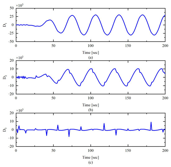 The system disturbances obtained through the high-gain disturbance observer are shown in Figure 9. Figure 9a illustrates the variation of disturbance D1 over time. It is worth noting that the shape of the D1 curve closely resembles the command signal curve. This is because a constant value was set for the load FL, and D1 represents the load torque disturbance to the system. As the angle of the cutting head changes, the load torque also changes, leading to D1 varying with the command signal. Figure 9b and Figure 9c show the variations of disturbances D2 and D3 over time, respectively. The observed disturbances are smooth curves, which can help the controller make early compensations, thus effectively managing the impact of disturbances.