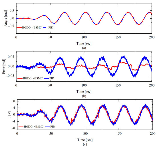 Comparison of experimental results. (a) Angular displacement tracking curve, (b) Angular tracking error curve, (c) Controller input voltage curve.