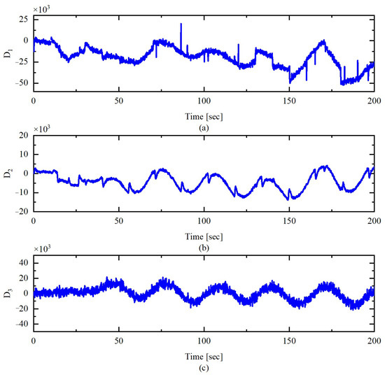 Figure 12 presents the observed values of the high-gain disturbance observer. Figure 12a shows the observed values of D1. Compared to the simulation, D1 does not exhibit a correlation with the command signal over time, likely because the distribution of rock and soil in the actual roadway is uneven, causing the cutting load to fluctuate continuously and resulting in the observed values jumping frequently. Figure 12b and Figure 12c show the observed values of D2 and D3, respectively. All three observed values exhibit some degree of fluctuation, which can affect the tracking performance of the system. The fluctuations may be due to the high-speed rotation of the cutting head during operation, leading to non-smooth forces. Specifically, D1, which is related to the cutting load, naturally does not produce a smooth curve because the forces on the high-speed rotating cutting head are not smooth. For D2 and D3, since the entire cutting arm is rigidly connected, the continuous fluctuations in the cutting load directly affect the actuators, causing fluctuations in the hydraulic pressure, resulting in non-smooth D2 and D3 curves. Notably, although the exact value of the load cannot be obtained from D1, its trend can be used for qualitative analysis of the cutting load, which helps in analyzing the composition of the cut coal and rock and in judging the working state of the cutting head to adjust the swinging speed and prevent equipment damage.