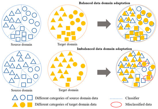 This represents a more realistic and complex scenario that warrants further investigation. Ding et al. [24] introduced an innovative framework for deep imbalanced domain adaptation that facilitates precise matching of latent spaces through the implementation of cost-sensitive learning and margin loss regularization techniques. Zhao et al. [25] created a novel data augmentation technique called mix-up with semantic regularization, which controls the semantics of generated samples in both input and latent spaces to balance the classes. Lee et al. [26] proposed a novel class imbalance domain adaptation approach that employs metric learning to improve feature distinctiveness by increasing the distance between samples from different classes while lowering the distance between samples from the same class. Nevertheless, the aforementioned studies, along with others [27,28], generally concentrate on tackling imbalanced domain adaptation from the perspective of addressing data imbalances, failing to take into account the fact that training imbalanced data in the UDA context results in more severe conditional distribution shifts, as illustrated in Figure 1. The majority class can heavily influence the decision boundary in a source domain characterized by imbalanced category distributions. Additionally, the lack of labels for target domain data complicates achieving conditional distribution alignment. These challenges impede diagnostic models from acquiring robust and discriminative features.