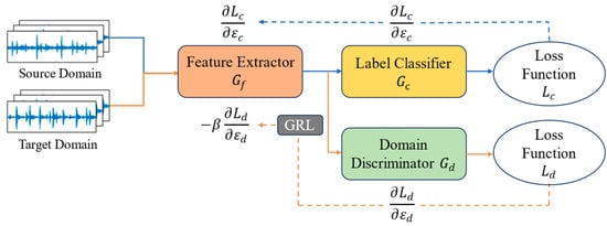 Inspired by the generative adversarial network (GAN), Ganin et al. [29] pioneered the incorporation of an adversarial mechanism in the training of domain adaptation, resulting in the development of a framework known as Domain Adversarial Neural Network (DANN). As illustrated in Figure 2, the DANN comprises three primary components: a feature extractor (), a label classifier (), and a domain discriminator (). The main objective of DANN is to ensure that the extracted features are sufficiently distinct to perform the classification task effectively. Simultaneously, it aims to make it challenging for the domain discriminator to determine whether the features originate from the source domain or the target domain.