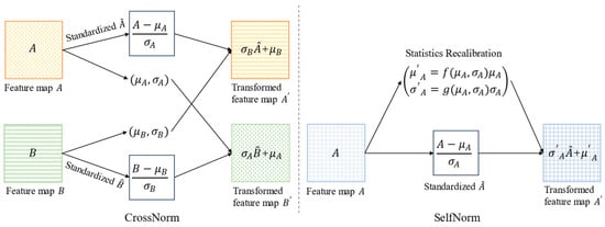 For each instance, several feature maps are generated after being input into the convolutional neural network. As illustrated in Figure 3, CrossNorm exchanges the mean and variance between feature maps, enriching the style of the training data and enhancing distributional generalization. SelfNorm recalibrates the statistical information by utilizing the fully connected (FC) layers as the attention functions and , which assist the model in emphasizing useful features while suppressing irrelevant ones. SelfNorm learns the parameters during training and fixes them for use during testing, while CrossNorm is utilized exclusively during training. Both methods effectively enhance the model’s generalization robustness.