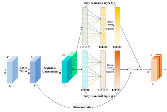 Afterward, the mean and standard deviation for are computed for each channel individually, and the resulting statistics are concatenated into a new tensor . The new tensor is utilized to recalibrate the statistics via two FC layers, and , in order to highlight informative features and diminish those that are less useful. This process can be expressed as Equations (11) and (12):