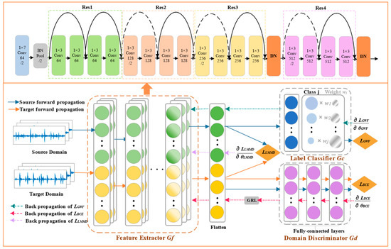 During the training process, the optimization loss functions associated with each component are aggregated to formulate an overall optimization objective that encompasses all optimization tasks. Assuming that the high-dimensional features of the source and target domain data are and , respectively, the specific optimization objectives can be expressed as Equations (19)–(21):