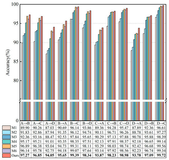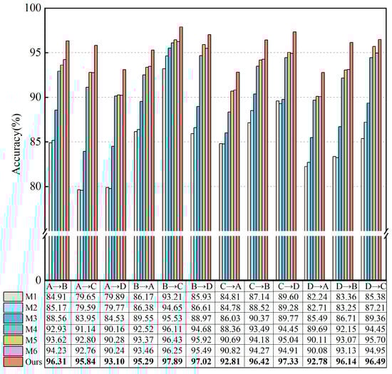 In this research, the four domains were transferred to each other, and a total of twelve tasks were created using the CWRU dataset to evaluate the transfer capabilities of the proposed method under various working conditions: A → B/C/D, B → A/C/D, C → A/B/D, and D → A/B/C. For instance, A → B indicates that data gathered under condition A serves as the source domain sample for training the network model, while data from condition B acts as the target domain sample for testing the model’s performance. To ensure that the transfer tasks are performed in an unsupervised manner, the label information of the target domain samples is not used in the training phase.